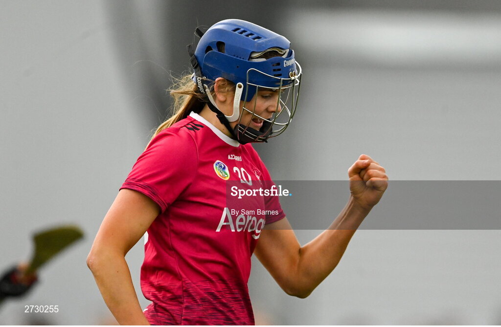 11 February 2024; Ai´ne O'Loughlin of University of Galway celebrates after scoring her side's third goal during the Electric Ireland Purcell Cup final match between University of Galway and SETU Carlow at University of Galway Connacht GAA AirDome in Bekan, Mayo. Photo by Sam Barnes/Sportsfile