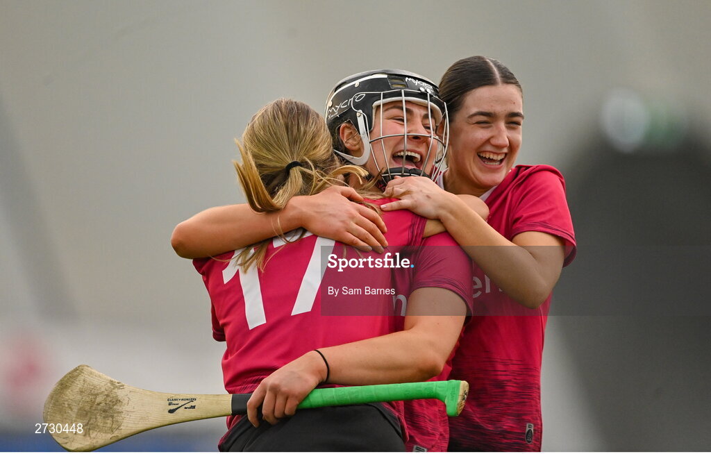 11 February 2024; University of Galway players, from left, Keisha Coleman, Tiffanie Fitzgerald and Tegan Canning celebrate after their side's victory in the Electric Ireland Purcell Cup final match between University of Galway and SETU Carlow at University of Galway Connacht GAA AirDome in Bekan, Mayo. Photo by Sam Barnes/Sportsfile