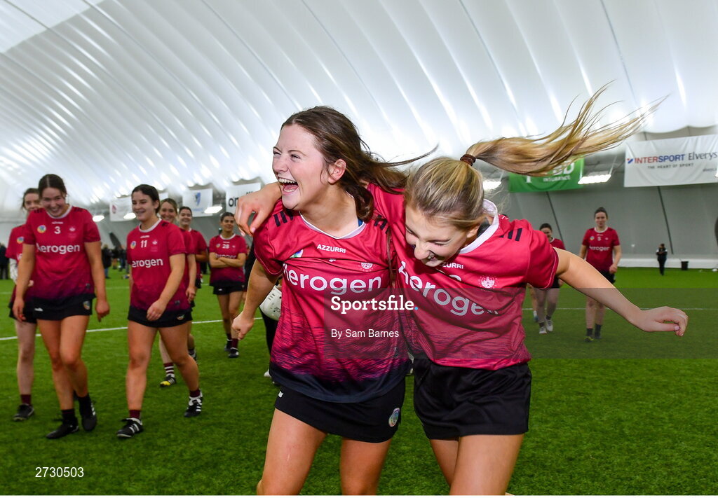 11 February 2024; University of Galway players Emily O'Connor, left, and Paige Foley celebrate after their side's victory in the Electric Ireland Purcell Cup final match between University of Galway and SETU Carlow at University of Galway Connacht GAA AirDome in Bekan, Mayo. Photo by Sam Barnes/Sportsfile