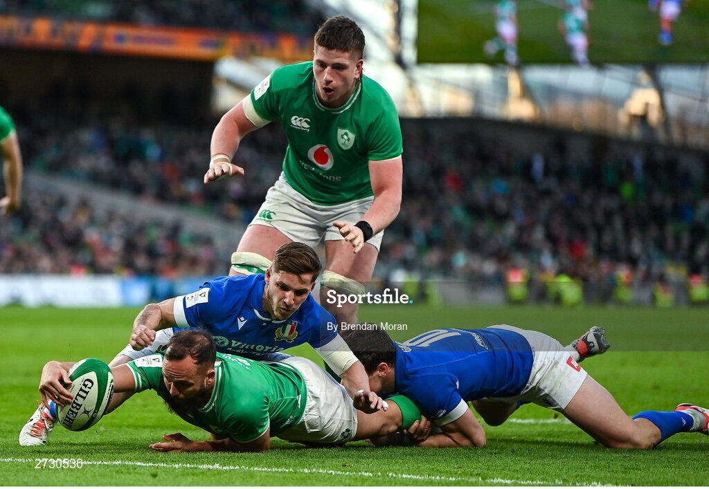 11 February 2024; Jamison Gibson-Park of Ireland scores his side's seventh try during the Guinness Six Nations Rugby Championship match between Ireland and Italy at the Aviva Stadium in Dublin. Photo by Brendan Moran/Sportsfile