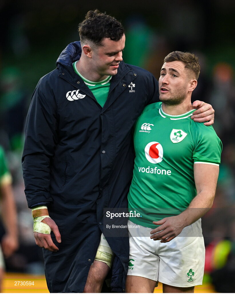 11 February 2024; James Ryan, left, and Jordan Larmour of Ireland after the Guinness Six Nations Rugby Championship match between Ireland and Italy at the Aviva Stadium in Dublin. Photo by Brendan Moran/Sportsfile