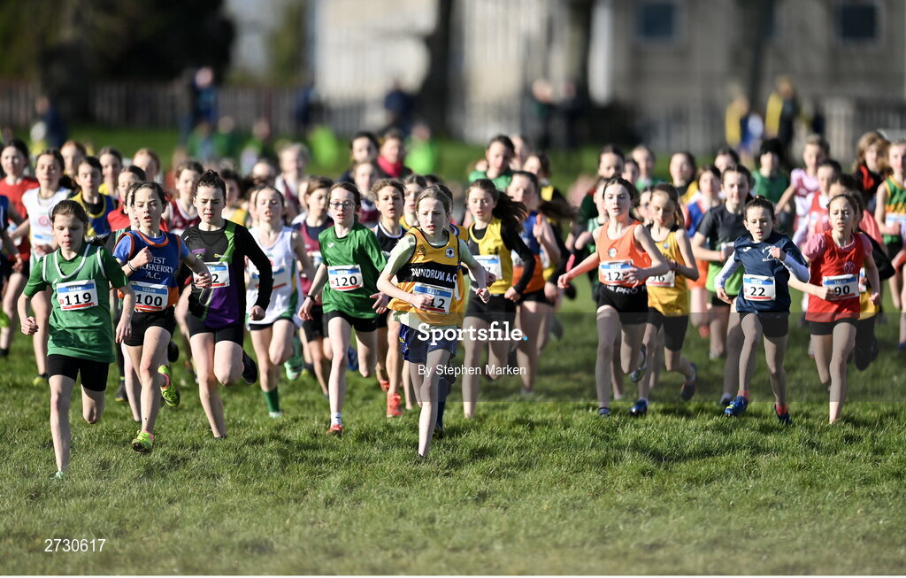11 February 2024; Ellen Maher of Dundrum AC, Tipperary, centre, competes in the Girls U11 1000m during the 123.ie National Intermediate, Masters & Juvenile B Cross Country Championships at DKiT Campus in Dundalk, Louth. Photo by Stephen Marken/Sportsfile