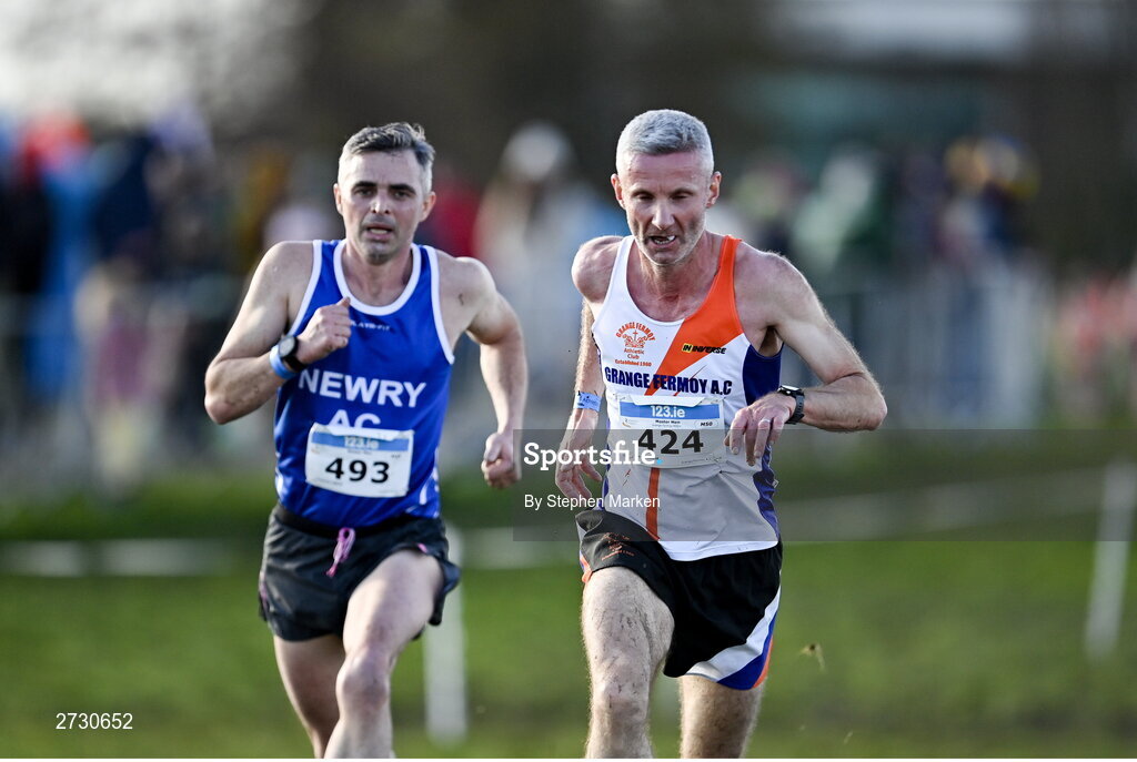11 February 2024; Liam O Connor of Grange Fermoy AC, Cork, right, and Andrew Hicks of Newry AC, Antrim, compete in the masters men's 7000m during the 123.ie National Intermediate, Masters & Juvenile B Cross Country Championships at DKiT Campus in Dundalk, Louth. Photo by Stephen Marken/Sportsfile