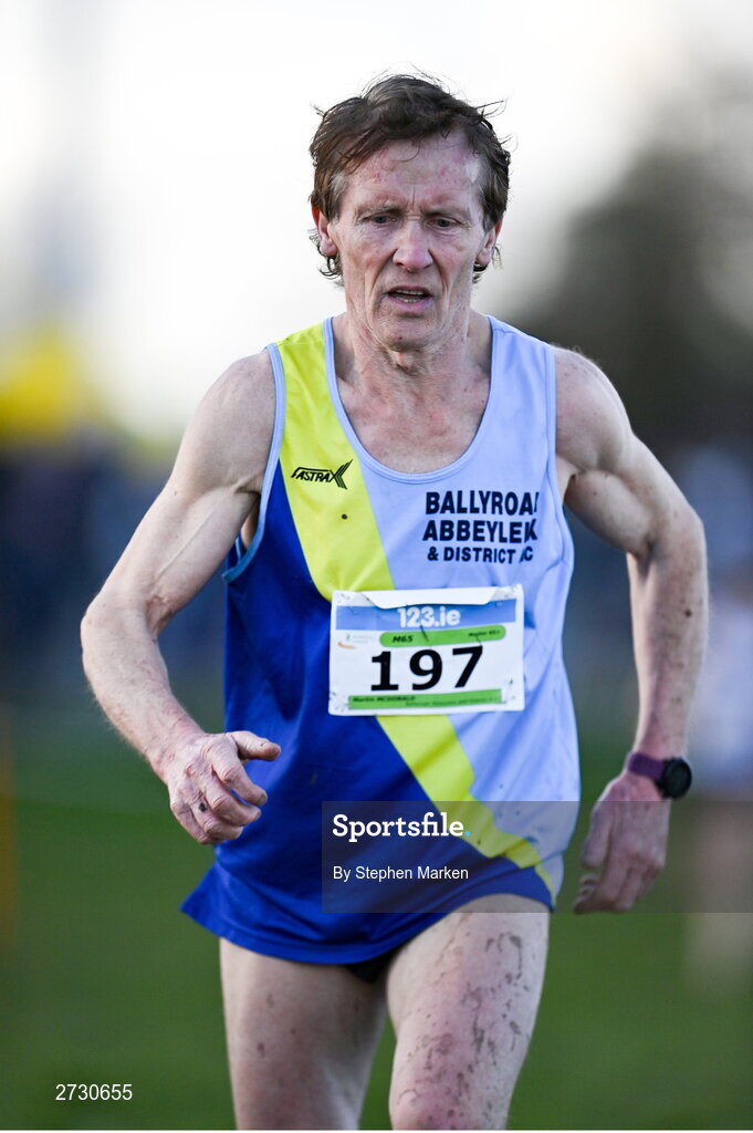 11 February 2024; Martin Mcdonald of Ballyroan Abbeyleix and District AC, Laois, on his way to placing third in the over 65 men's 4000m during the 123.ie National Intermediate, Masters & Juvenile B Cross Country Championships at DKiT Campus in Dundalk, Louth. Photo by Stephen Marken/Sportsfile