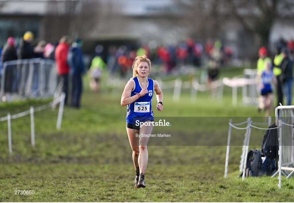 11 February 2024; Orla Duffy of Dublin City Harriers AC, on her way to second place in the intermediate women's 5000m during the 123.ie National Intermediate, Masters & Juvenile B Cross Country Championships at DKiT Campus in Dundalk, Louth. Photo by Stephen Marken/Sportsfile