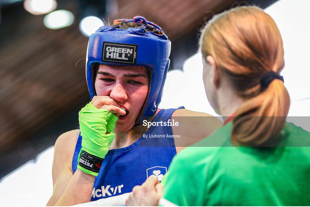 11 February 2024; Aoife O'Rourke of Ireland in action against Baison Manikon of Thailand in their middleweight 75kg final bout during the 75th International Boxing Tournament Strandja in Sofia, Bulgaria. Photo by Liubomir Asenov /Sportsfile
