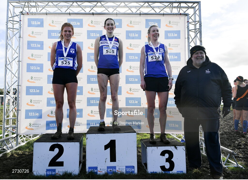 11 February 2024; From left Orla Duffy of Dublin City Harriers AC, Amy Greene of Finn Valley AC, Donegal, and Susan Mcmanus of Dublin City Harriers AC, with Athletics Ireland President John Cronin after the intermediate women's 5000m during the 123.ie National Intermediate, Masters & Juvenile B Cross Country Championships at DKiT Campus in Dundalk, Louth. Photo by Stephen Marken/Sportsfile
