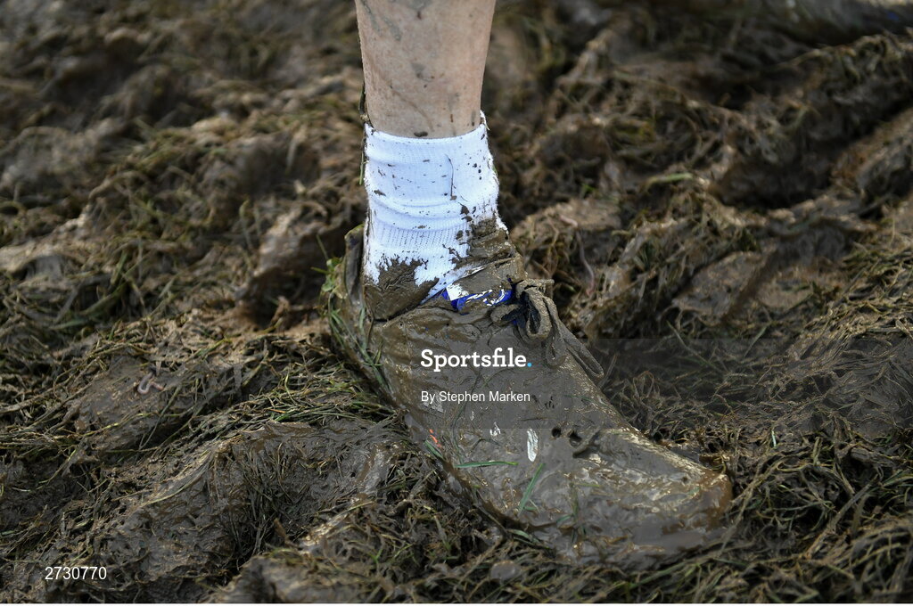 11 February 2024; A detailed view of mucky running spikes during the 123.ie National Intermediate, Masters & Juvenile B Cross Country Championships at DKiT Campus in Dundalk, Louth. Photo by Stephen Marken/Sportsfile