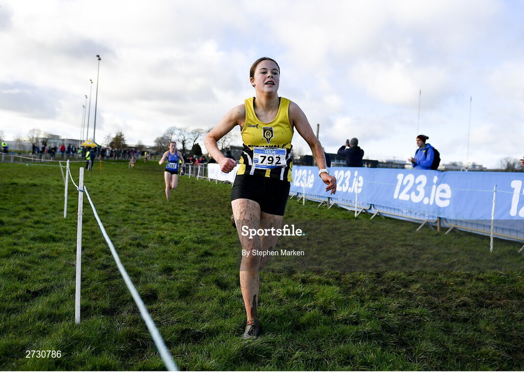 11 February 2024; Della Mc Loughlin of Oughaval AC, Laois, on her way to winning the Girls U17 3000m during the 123.ie National Intermediate, Masters & Juvenile B Cross Country Championships at DKiT Campus in Dundalk, Louth. Photo by Stephen Marken/Sportsfile