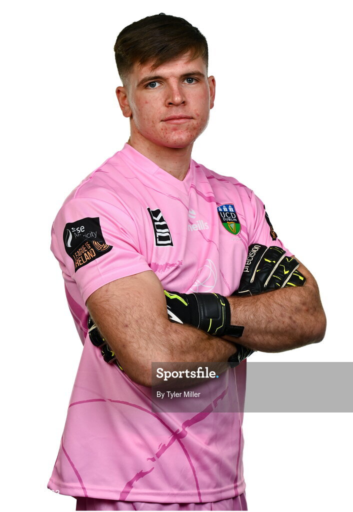 9 February 2024; Goalkeeper Kian Moore poses for a portrait during a UCD FC squad portraits session at UCD Bowl in Belfield, Dublin. Photo by Tyler Miller/Sportsfile