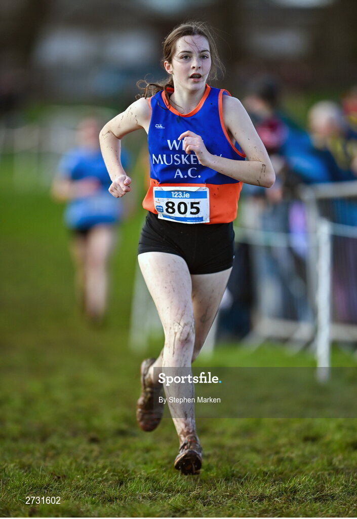 11 February 2024; Rebecca O'Neill of West Muskerry AC, Cork, competes in the Girls U17 3000m during the 123.ie National Intermediate, Masters & Juvenile B Cross Country Championships at DKiT Campus in Dundalk, Louth. Photo by Stephen Marken/Sportsfile