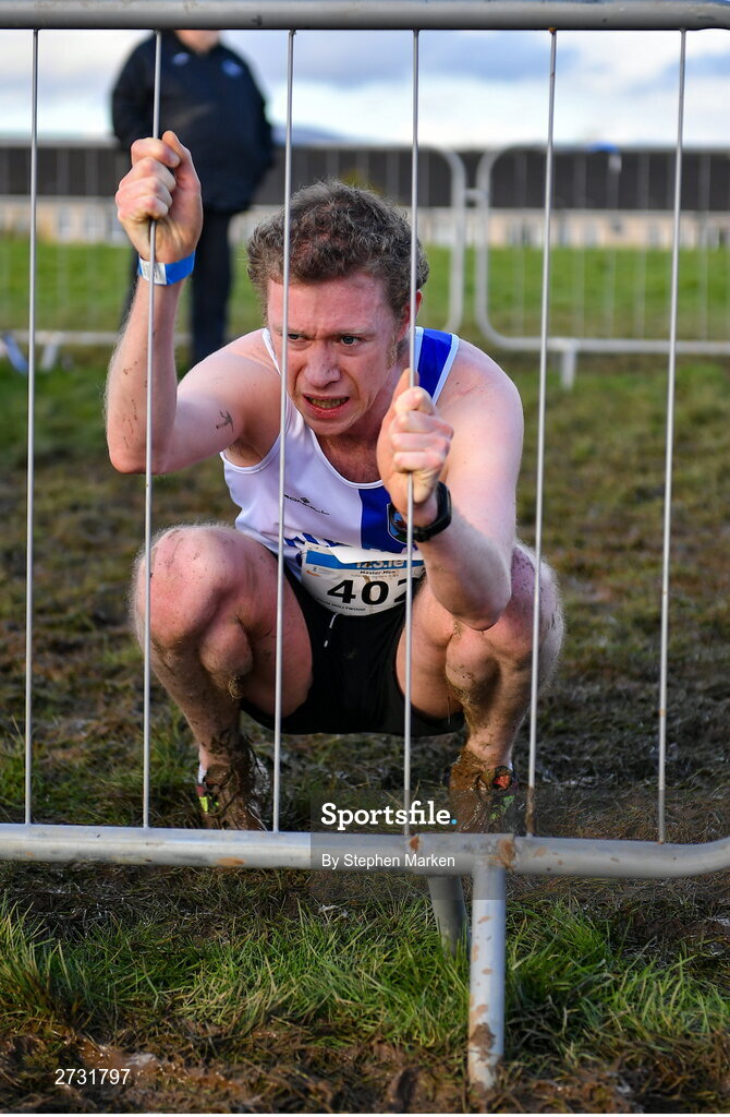 11 February 2024; David Hollywood of Tullamore Harriers AC, Offaly, recovers after the masters men's 7000m during the 123.ie National Intermediate, Masters & Juvenile B Cross Country Championships at DKiT Campus in Dundalk, Louth. Photo by Stephen Marken/Sportsfile