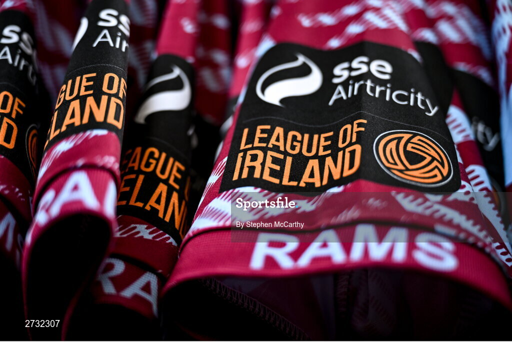 12 February 2024; A detailed view of the sleeve of the Cobh Ramblers jersey featuring the SSE Airtricity League of Ireland First Division badge and the clubs nickmane "Rams" during a Cobh Ramblers FC squad portraits session at St Coleman's Park in Cobh, Cork. Photo by Stephen McCarthy/Sportsfile