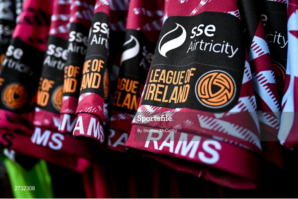 12 February 2024; A detailed view of the sleeve of the Cobh Ramblers jersey featuring the SSE Airtricity League of Ireland First Division badge and the clubs nickmane "Rams" during a Cobh Ramblers FC squad portraits session at St Coleman's Park in Cobh, Cork. Photo by Stephen McCarthy/Sportsfile