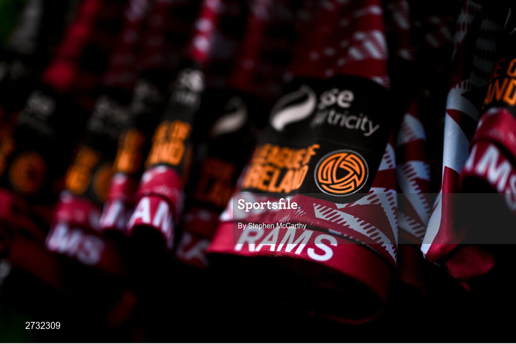 12 February 2024; A detailed view of the sleeve of the Cobh Ramblers jersey featuring the SSE Airtricity League of Ireland First Division badge and the clubs nickmane "Rams" during a Cobh Ramblers FC squad portraits session at St Coleman's Park in Cobh, Cork. Photo by Stephen McCarthy/Sportsfile