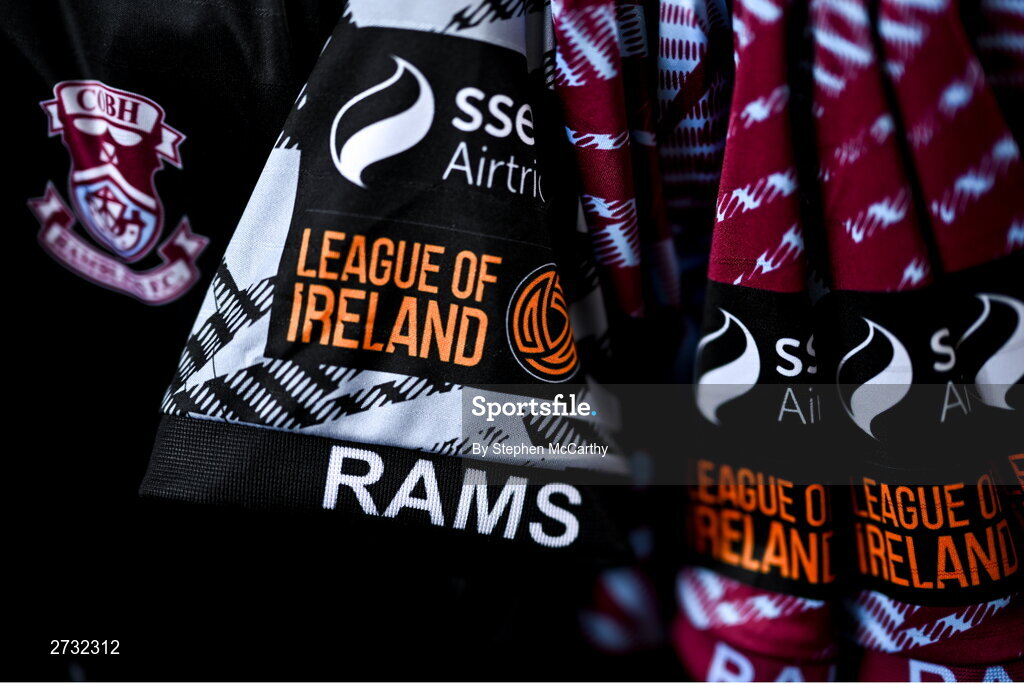 12 February 2024; A detailed view of the Cobh Ramblers jersey featuring the SSE Airtricity League of Ireland First Division badge and the clubs nickmane "Rams" during a Cobh Ramblers FC squad portraits session at St Coleman's Park in Cobh, Cork. Photo by Stephen McCarthy/Sportsfile