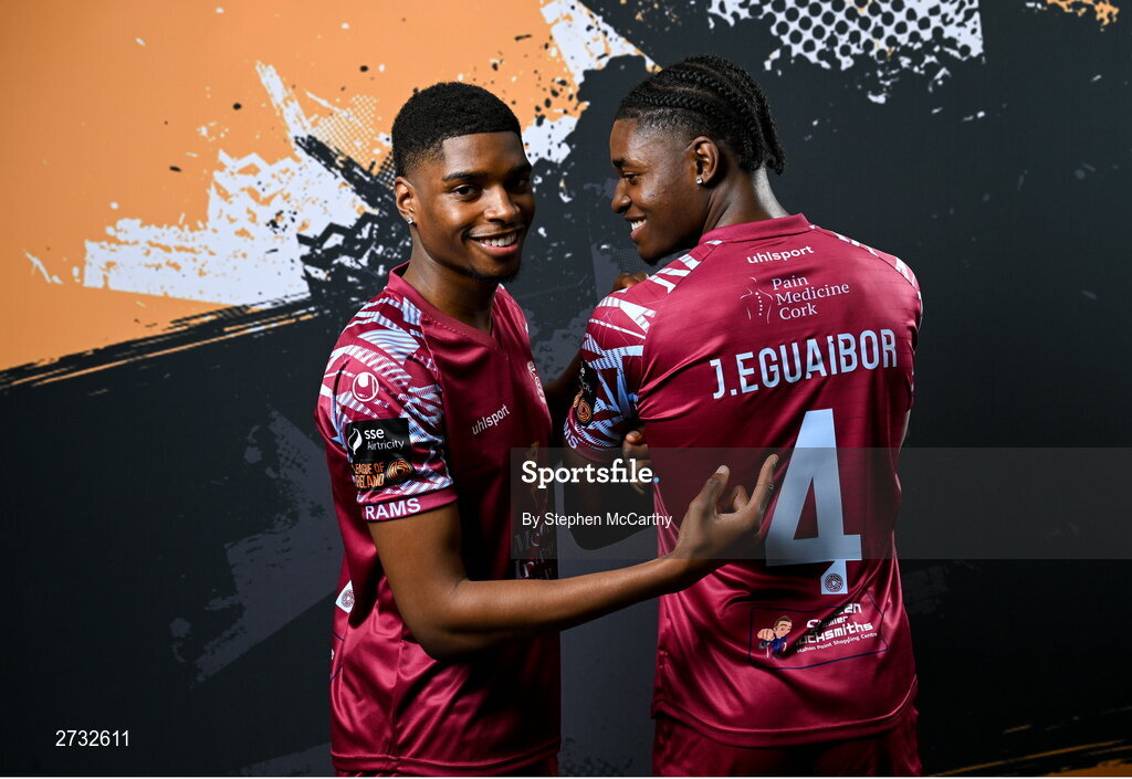 12 February 2024; Brothers David Eguaibor, left, and Justin Eguaibor pose for a portrait during a Cobh Ramblers FC squad portraits session at St Coleman's Park in Cobh, Cork. Photo by Stephen McCarthy/Sportsfile