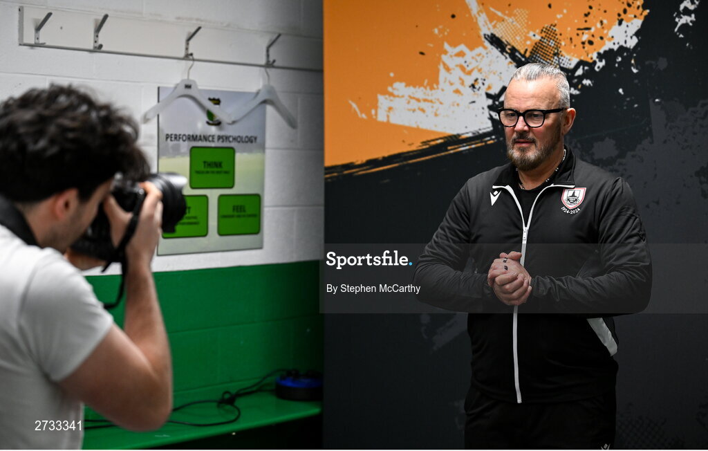 13 February 2024; Manager Stephen Henderson poses for Sportsfile photographer Harry Murphy during a Longford Town FC squad portraits session at John Hyland Park in Baldonnell, Dublin. Photo by Stephen McCarthy/Sportsfile