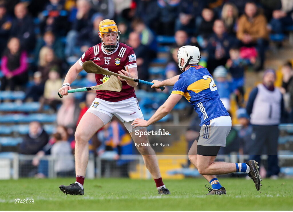 24 February 2024; Niall Mitchell of Westmeath in action against Johnny Ryan of Tipperary during the Allianz Hurling League Division 1 Group B match between Tipperary and Westmeath at FBD Semple Stadium in Thurles, Tipperary. Photo by Michael P Ryan/Sportsfile