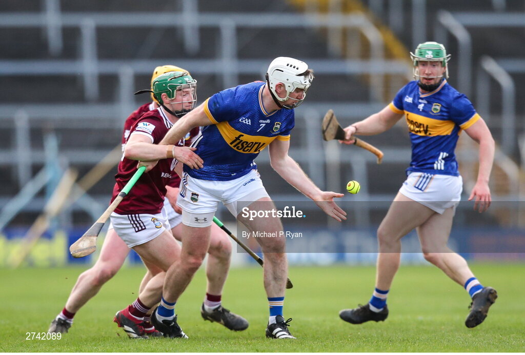 24 February 2024; Seamus Kennedy of Tipperary in action against David Williams of Westmeath during the Allianz Hurling League Division 1 Group B match between Tipperary and Westmeath at FBD Semple Stadium in Thurles, Tipperary. Photo by Michael P Ryan/Sportsfile