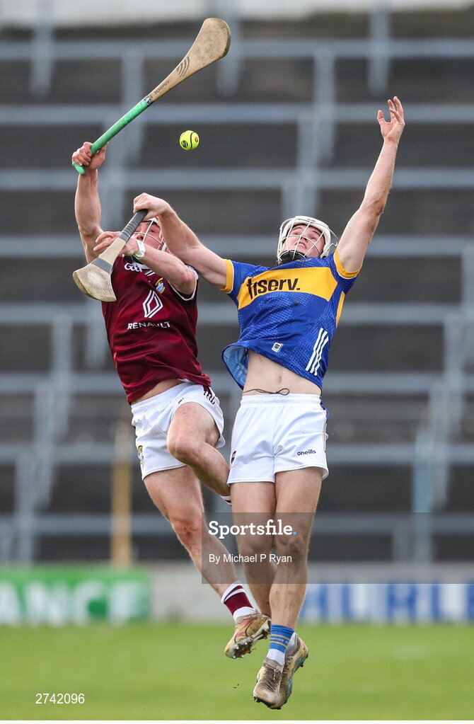 24 February 2024; Peter Clarke of Westmeath in action against Cathal Quinn of Tipperary during the Allianz Hurling League Division 1 Group B match between Tipperary and Westmeath at FBD Semple Stadium in Thurles, Tipperary. Photo by Michael P Ryan/Sportsfile