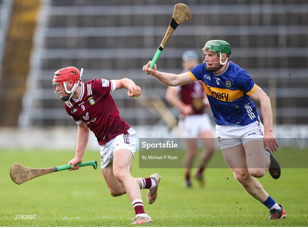 24 February 2024; Peter Clarke of Westmeath in action against Brian McGrath of Tipperary during the Allianz Hurling League Division 1 Group B match between Tipperary and Westmeath at FBD Semple Stadium in Thurles, Tipperary. Photo by Michael P Ryan/Sportsfile