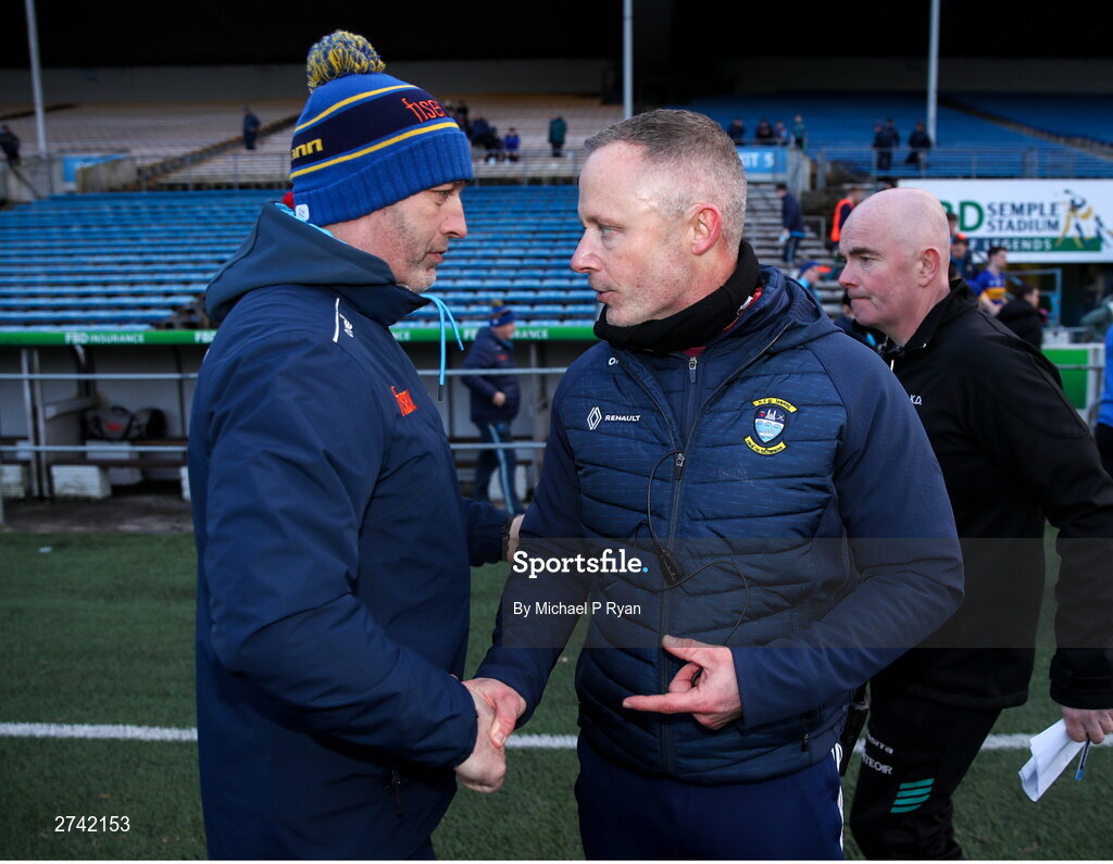24 February 2024; Tipperary manager Liam Cahill, left, shakes hands with Westmeath manager Joe Fortune after the Allianz Hurling League Division 1 Group B match between Tipperary and Westmeath at FBD Semple Stadium in Thurles, Tipperary. Photo by Michael P Ryan/Sportsfile