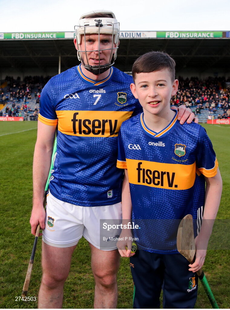 24 February 2024; Tipperary captain Seamus Kennedy with mascot Tommy Cleary from Moyne/Templetuohy before the Allianz Hurling League Division 1 Group B match between Tipperary and Westmeath at FBD Semple Stadium in Thurles, Tipperary. Photo by Michael P Ryan/Sportsfile