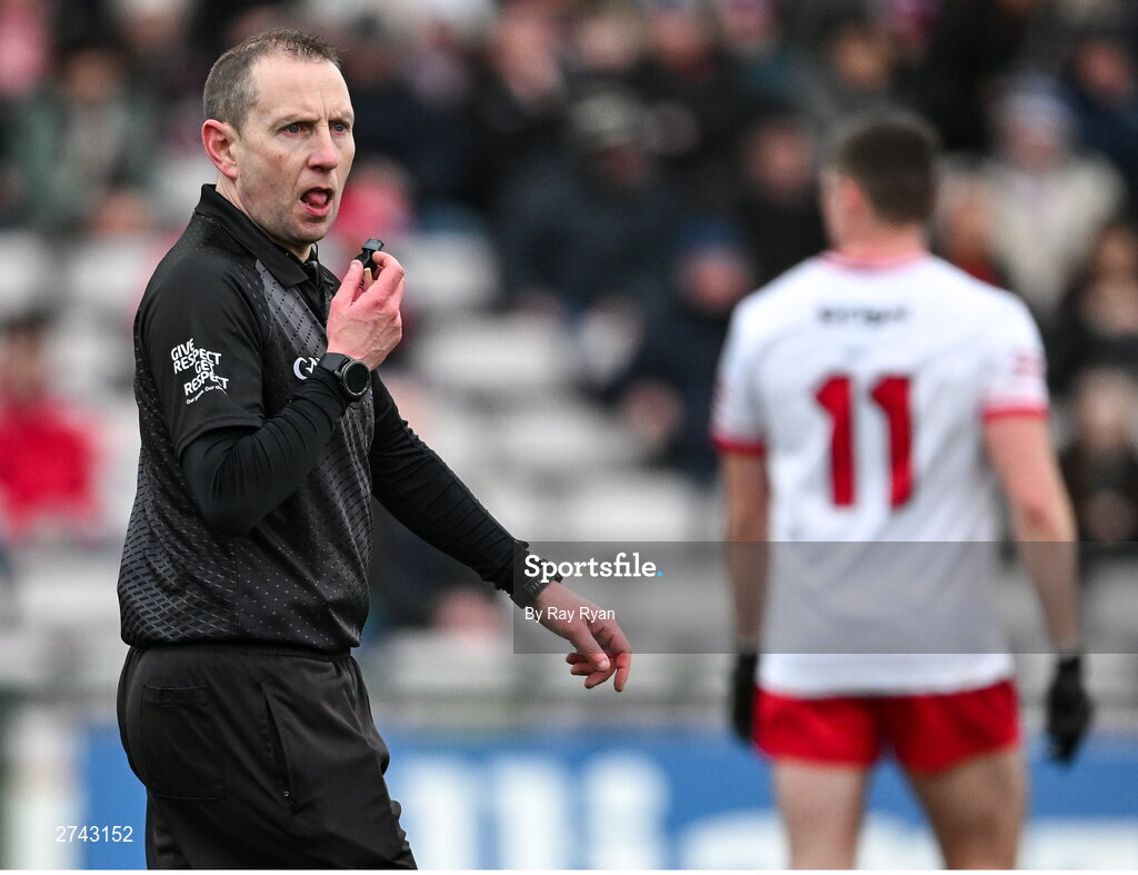 25 February 2024; Referee Derek O'Mahoney during the Allianz Football League Division 1 match between Galway and Derry at Pearse Stadium in Galway. Photo by Ray Ryan/Sportsfile