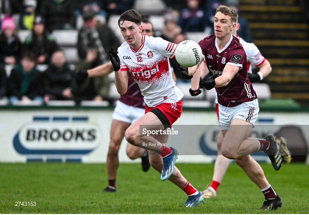 25 February 2024; Dylan McHugh of Galway in action against Paul Cassidy of Derry during the Allianz Football League Division 1 match between Galway and Derry at Pearse Stadium in Galway. Photo by Ray Ryan/Sportsfile