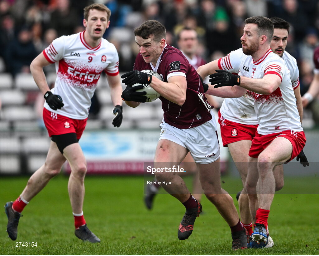 25 February 2024; John Daly of Galway in action against Niall Loughlin of Derry during the Allianz Football League Division 1 match between Galway and Derry at Pearse Stadium in Galway. Photo by Ray Ryan/Sportsfile