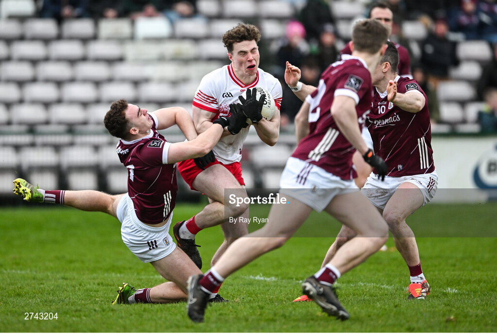 25 February 2024; Eoin McEvoy of Derry in action against Daniel O’Flaherty of Galway during the Allianz Football League Division 1 match between Galway and Derry at Pearse Stadium in Galway. Photo by Ray Ryan/Sportsfile
