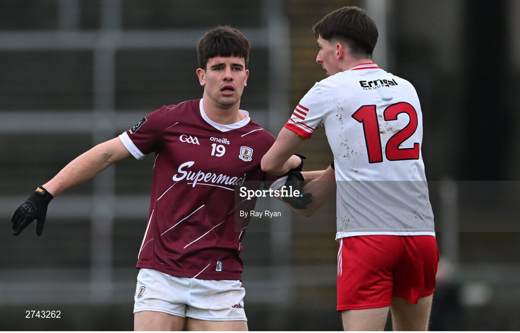 25 February 2024; Sean Kelly of Galway in action against Paul Cassidy of Derry during the Allianz Football League Division 1 match between Galway and Derry at Pearse Stadium in Galway. Photo by Ray Ryan/Sportsfile