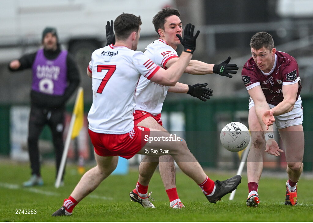 25 February 2024; Johnny Heaney of Galway in action against Padraig McGrogan and Conor McCluskey of Derry during the Allianz Football League Division 1 match between Galway and Derry at Pearse Stadium in Galway. Photo by Ray Ryan/Sportsfile