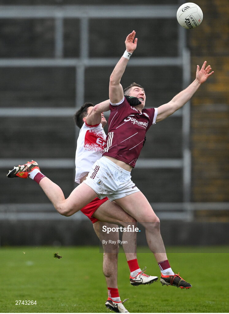 25 February 2024; Johnny Heaney of Galway in action against Conor McCluskey of Derry during the Allianz Football League Division 1 match between Galway and Derry at Pearse Stadium in Galway. Photo by Ray Ryan/Sportsfile