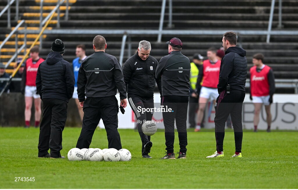 25 February 2024; Galway manager Padraic Joyce with his management team before the Allianz Football League Division 1 match between Galway and Derry at Pearse Stadium in Galway. Photo by Ray Ryan/Sportsfile