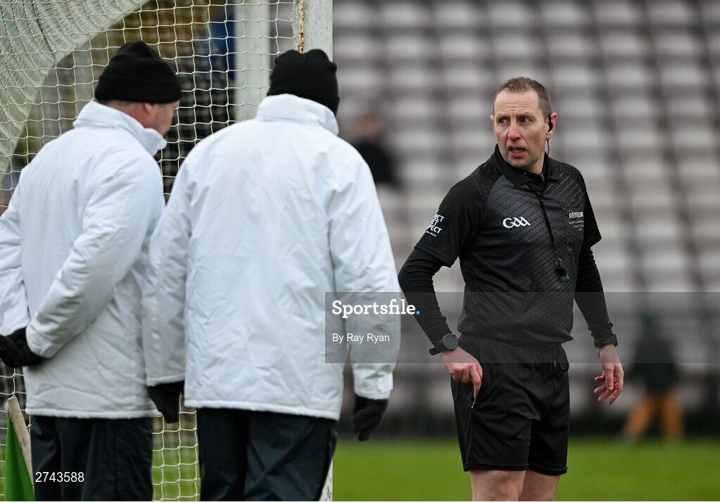25 February 2024; Referee Derek O'Mahoney consults his umpires as he awarded Derry a penalty during the Allianz Football League Division 1 match between Galway and Derry at Pearse Stadium in Galway. Photo by Ray Ryan/Sportsfile