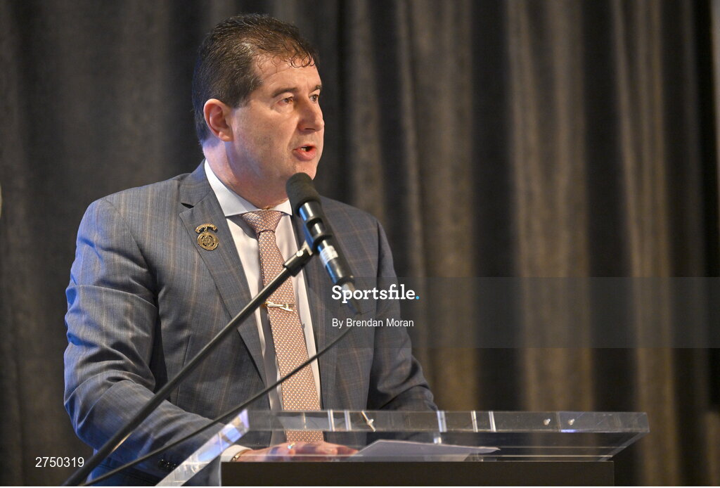 2 March 2024; Uachtarán Cumann Peil Gael na mBan, Mícheál Naughton addresses delegates during the LGFA Annual Congress at The Falls Hotel in Ennistymon, Clare. Photo by Brendan Moran/Sportsfile