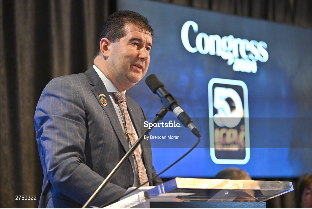 2 March 2024; Uachtarán Cumann Peil Gael na mBan, Mícheál Naughton addresses delegates during the LGFA Annual Congress at The Falls Hotel in Ennistymon, Clare. Photo by Brendan Moran/Sportsfile