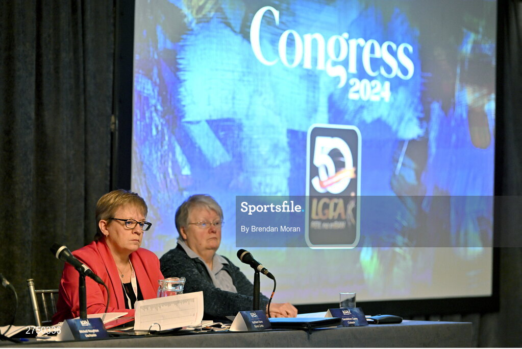 2 March 2024; LGFA assistant secretary Kathleen Kane, left, and treasurer Geraldine Carey during the LGFA Annual Congress at The Falls Hotel in Ennistymon, Clare. Photo by Brendan Moran/Sportsfile