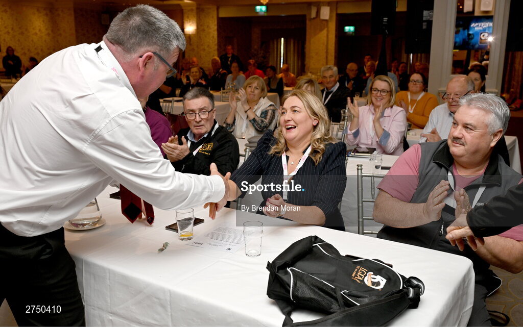 2 March 2024; Leinster LGFA President Trina Murray is congratulated by defeated presidential candidate Seamus O'Hanlon after being confirmed as Uachtarán Tofa of the LGFA during the LGFA Annual Congress at The Falls Hotel in Ennistymon, Clare. Photo by Brendan Moran/Sportsfile