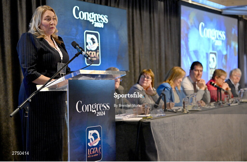 2 March 2024; Leinster LGFA President Trina Murray addresses delegates after being confirmed as Uachtarán Tofa of the LGFA during the LGFA Annual Congress at The Falls Hotel in Ennistymon, Clare. Photo by Brendan Moran/Sportsfile