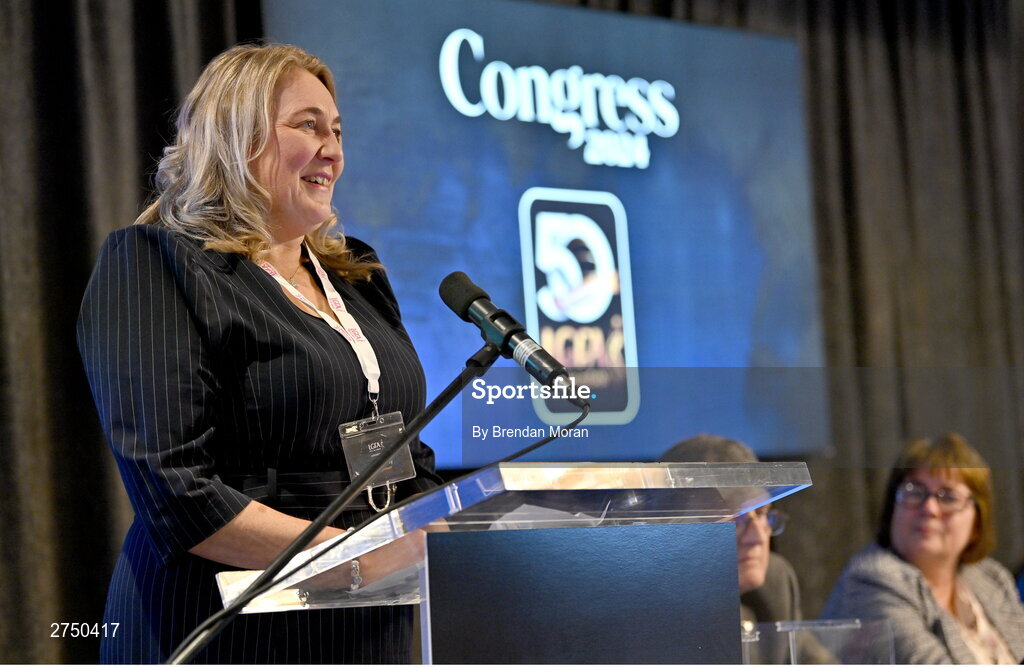 2 March 2024; Leinster LGFA President Trina Murray addresses delegates after being confirmed as Uachtarán Tofa of the LGFA during the LGFA Annual Congress at The Falls Hotel in Ennistymon, Clare. Photo by Brendan Moran/Sportsfile
