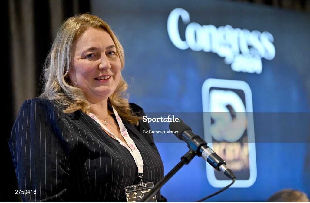 2 March 2024; Leinster LGFA President Trina Murray addresses delegates after being confirmed as Uachtarán Tofa of the LGFA during the LGFA Annual Congress at The Falls Hotel in Ennistymon, Clare. Photo by Brendan Moran/Sportsfile