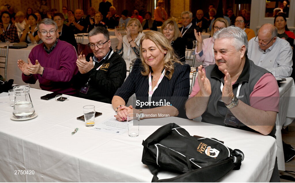 2 March 2024; Leinster LGFA President Trina Murray reacts after being confirmed as Uachtarán Tofa of the LGFA during the LGFA Annual Congress at The Falls Hotel in Ennistymon, Clare. Photo by Brendan Moran/Sportsfile