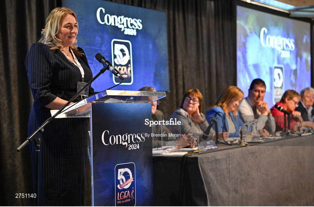 2 March 2024; Leinster LGFA President Trina Murray reacts after being confirmed as Uachtarán Tofa of the LGFA during the LGFA Annual Congress at The Falls Hotel in Ennistymon, Clare. Photo by Brendan Moran/Sportsfile