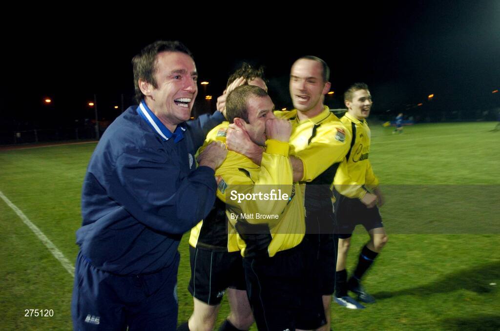 23 November 2007; Michal Funston, hidden, Finn Harps, celebrates after scoring his side's first goal with team-mates Shaun Holmes, second from left, Paddy McLoughlin and Martin McCann, assistant coach. eircom League of Ireland Promotion / Relegation play-off, second leg, Waterford United v Finn Harps. RSC, Waterford. Picture credit; Matt Browne / SPORTSFILE