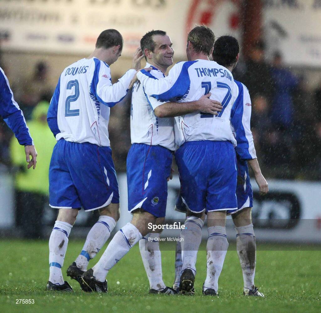 1 December 2007; Glen Ferguson, Linfield, centre, celebrates with team-mates Steven Douglas and Peter Thompson after scoring the first goal. Carnegie Premier League, Institute v Linfield, Drumahoe, Derry. Picture credit; Oliver McVeigh / SPORTSFILE