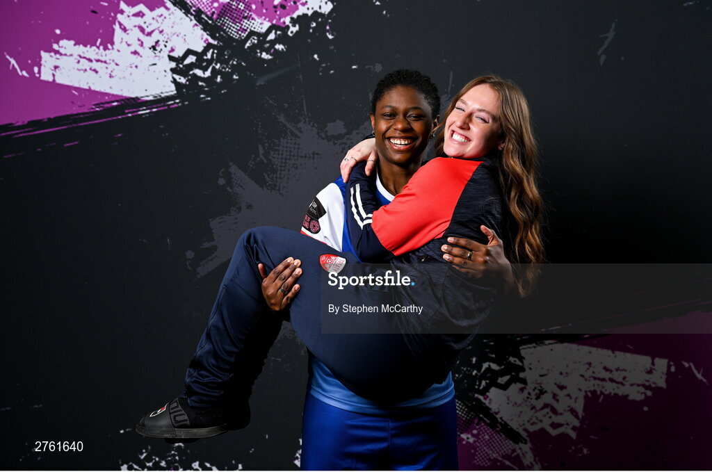 14 March 2024; Hannah Saidi and Delana Friesen, right, during a Treaty United FC squad portrait session at UL North Campus in Limerick. Photo by Stephen McCarthy/Sportsfile