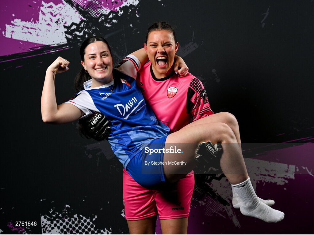 14 March 2024; Esra Kangal and goalkeeper Anne-Marie Ulliac during a Treaty United FC squad portrait session at UL North Campus in Limerick. Photo by Stephen McCarthy/Sportsfile